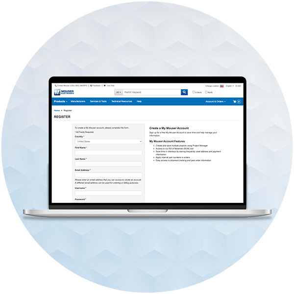 Verwalten Sie von Ihrem Laptop aus Ihr MyMouser-Konto: Importieren Sie Teilelisten, erstellen Sie Stücklisten (BOMs), verfolgen Sie Bestellungen, drucken Sie Rechnungen aus und greifen Sie auf API-Lösungen zu.