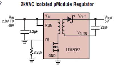Linear Technology/Analog Devices LTM8067 und LTM8068 µModule®-DC/DC-Wandler sind isolierte Sperrwandler-Leistungsmodule mit 2 kV AC. Im Gehäuse sind ein Schaltregler, Leistungsschalter, ein Transformer, ein LDO und alle Peripheriebauteile enthalten. Diese Wandler werden über einen Eingangsspannungsbereich von 2,8 bis 40 V betrieben und unterstützen einen Ausgangsspannungsbereich von 2,5 bis 18 V, der durch einen einzelnen externen Widerstand eingestellt wird.Merkmale