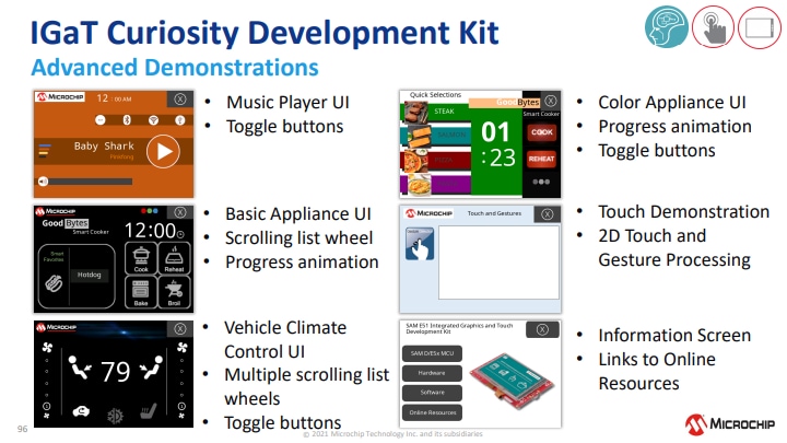 Die Microchip Technology SAM E51 Integrierte Grafik and Touch (IGaT) Curiosity Evaluation Kit ist eine Hardware-Plattform zur Evaluierung des SAME51J20A Mikrocontrollers. Das Kit integriert einen kompletten Touchscreen, TFT-Grafiken und eine Touch-Oberfläche in einer Single-Chip-Lösung. Es wird von der MPLAB ® X Integrated Development Umwelt (IDE) unterstützt. Das Kit bietet einen einfachen Zugriff zu den Funktionen des SAME51J20A, um das Bauelement in ein kundenspezifisches Design zu integrieren. Das Integrierte Grafik- und Touch Curiosity Evaluierungskit enthält einen Onboard-Debugger. Für die Programmierung des SAME51J20A-Bauelements sind keine externen Tools erforderlich.Merkmale